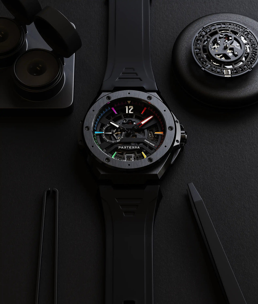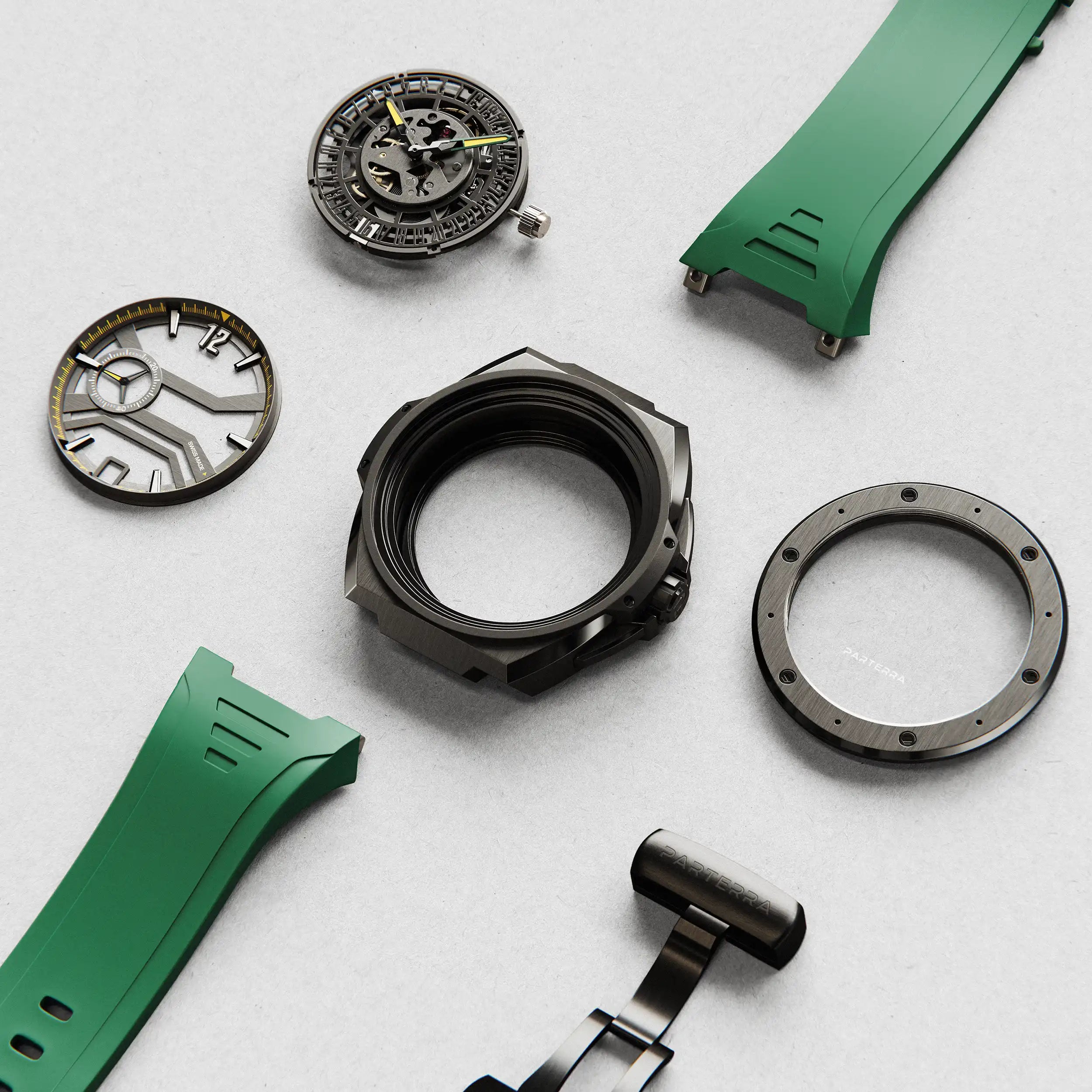 For Parterra, materials are an integral part of our watches. They must protect their caliber and survive the harshest conditions. That’s why we’ve chosen to use titanium grade 5 for our case, bezel, and clasp. It is an ultra-tough and lightweight material crafted with diamond tools.