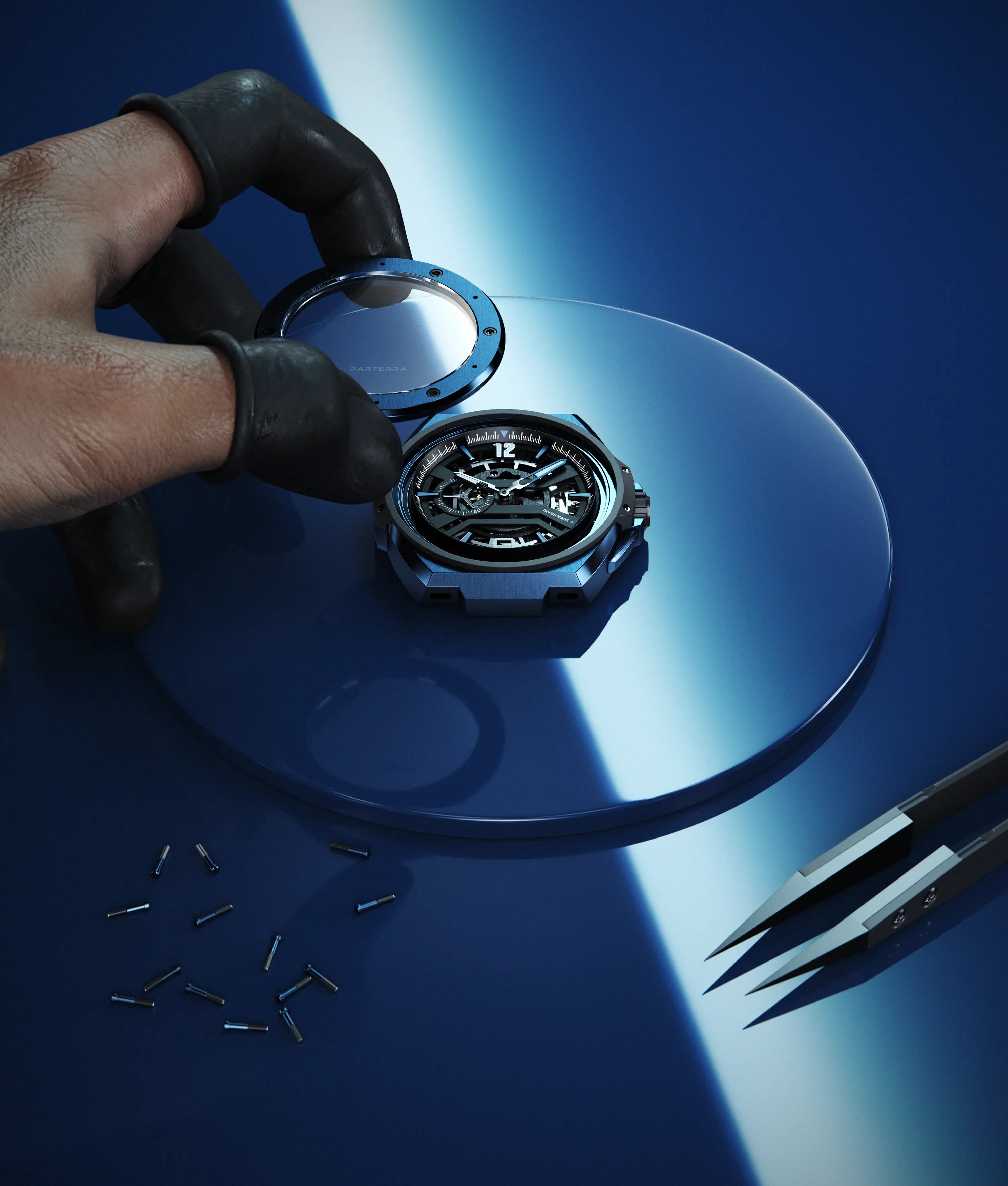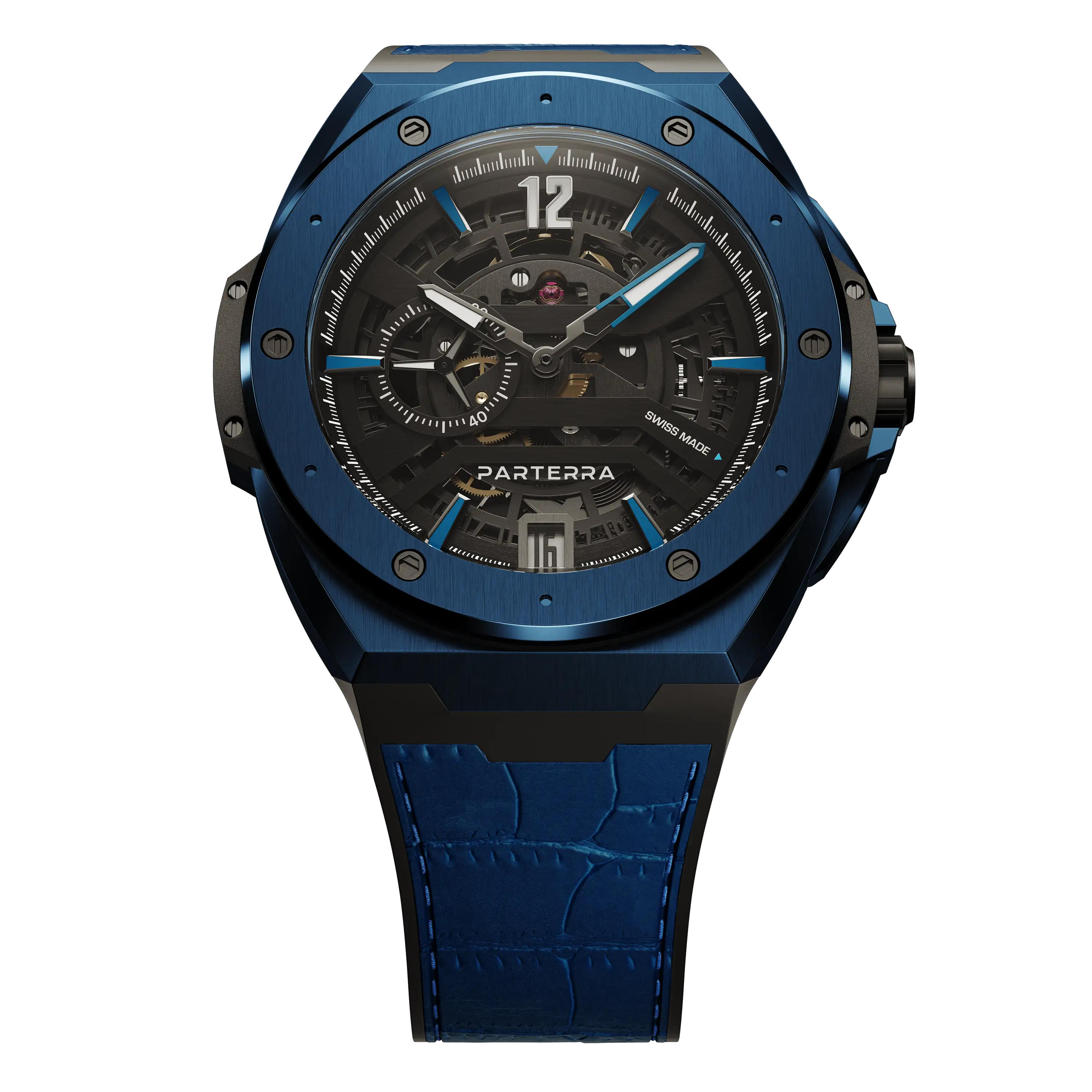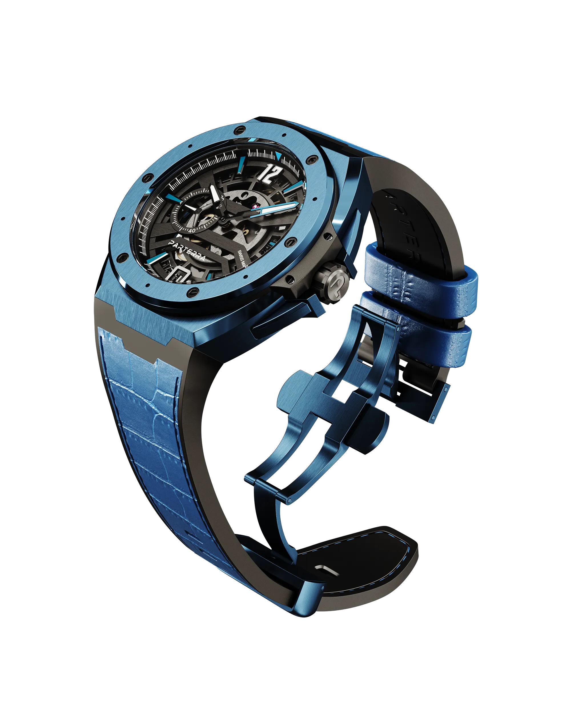 Powered by the P-01 skeleton caliber, an exclusive Swiss-made movement crafted exclusively for Parterra’s All-Terrain Collection, the Palawan Blue stands as a pinnacle of precision engineering and artisanal mastery.